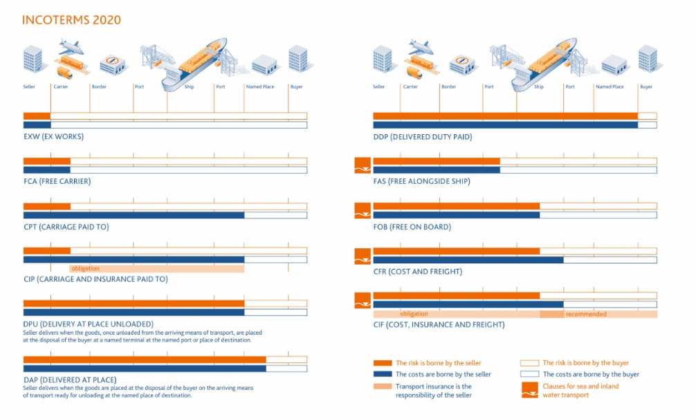 (EXW (EXWORK، (FCA ( Free Carrier، (FAS (Free Alongside Ship، (FOB (Free On Board، (CFR (Cost and Freight، (CIF (Cost and Insurance and Freight، (CPT (Carriage Paid To، (CIP (Carriage Insurance Paid، (DAP (Delivered At Place، (DPU (Delivered at Place Unloaded، (DDP (Delivered Duty Paid از جمله اصطلاحات و حالات INCOTERMS هستند که شرایط مختلفی را در حیطه حمل و نقل کالا برای خریدار و فروشنده تعیین میکنند.